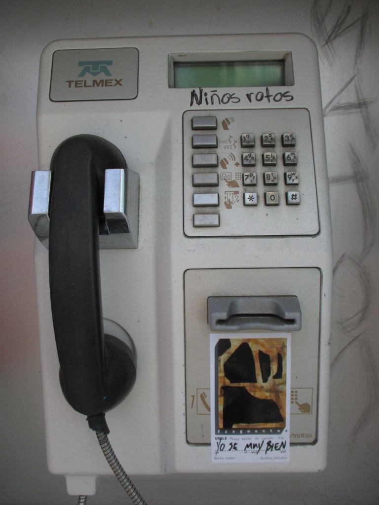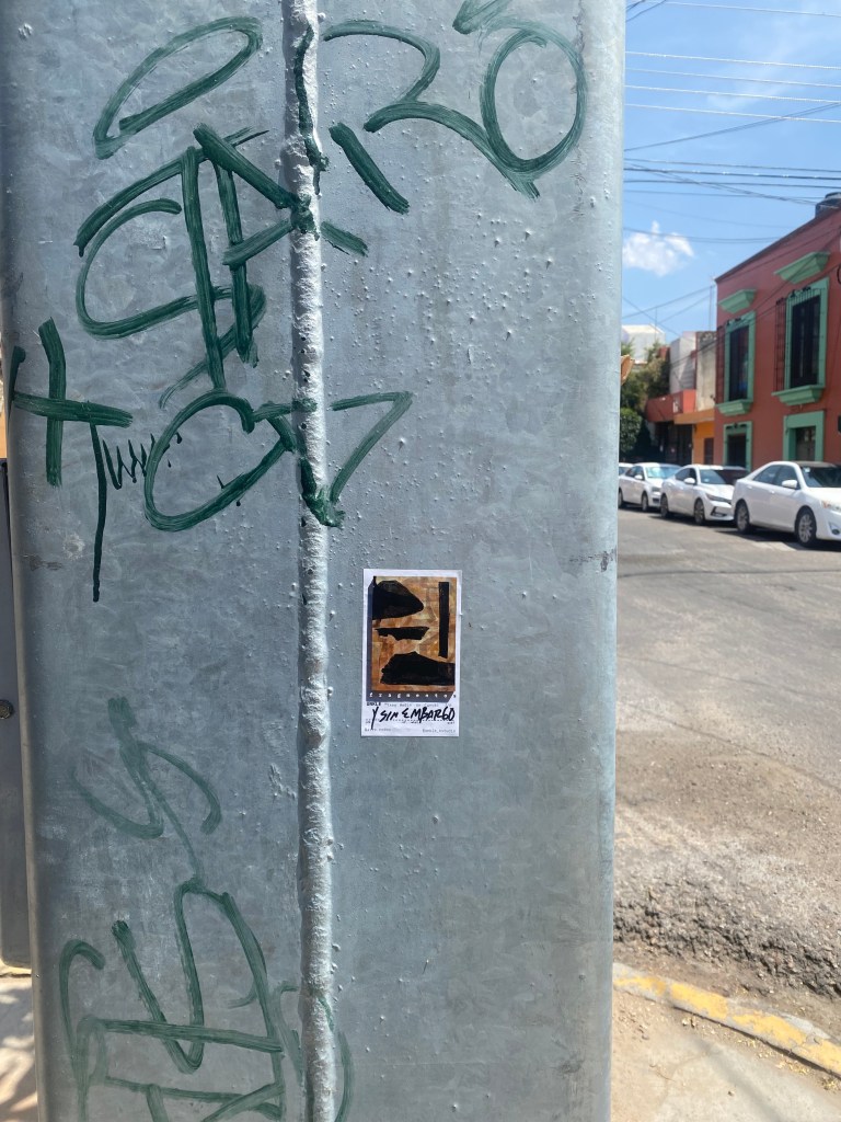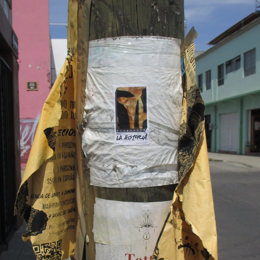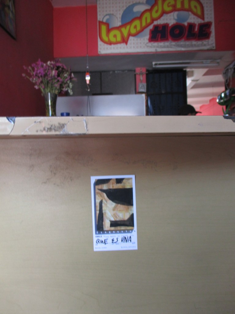 fragmentos [1, 2, 3, 4, 5, seis] is one of the most recent works by Guadalajara muralist, Unkle. Acrylic layers of paint and cotton paper on canvas reveal stratifications of time where letter abstractions peek through washes of burnt orange. Blackened broken bits float through the surface… off the canvas and perhaps into the sky if we turn away…